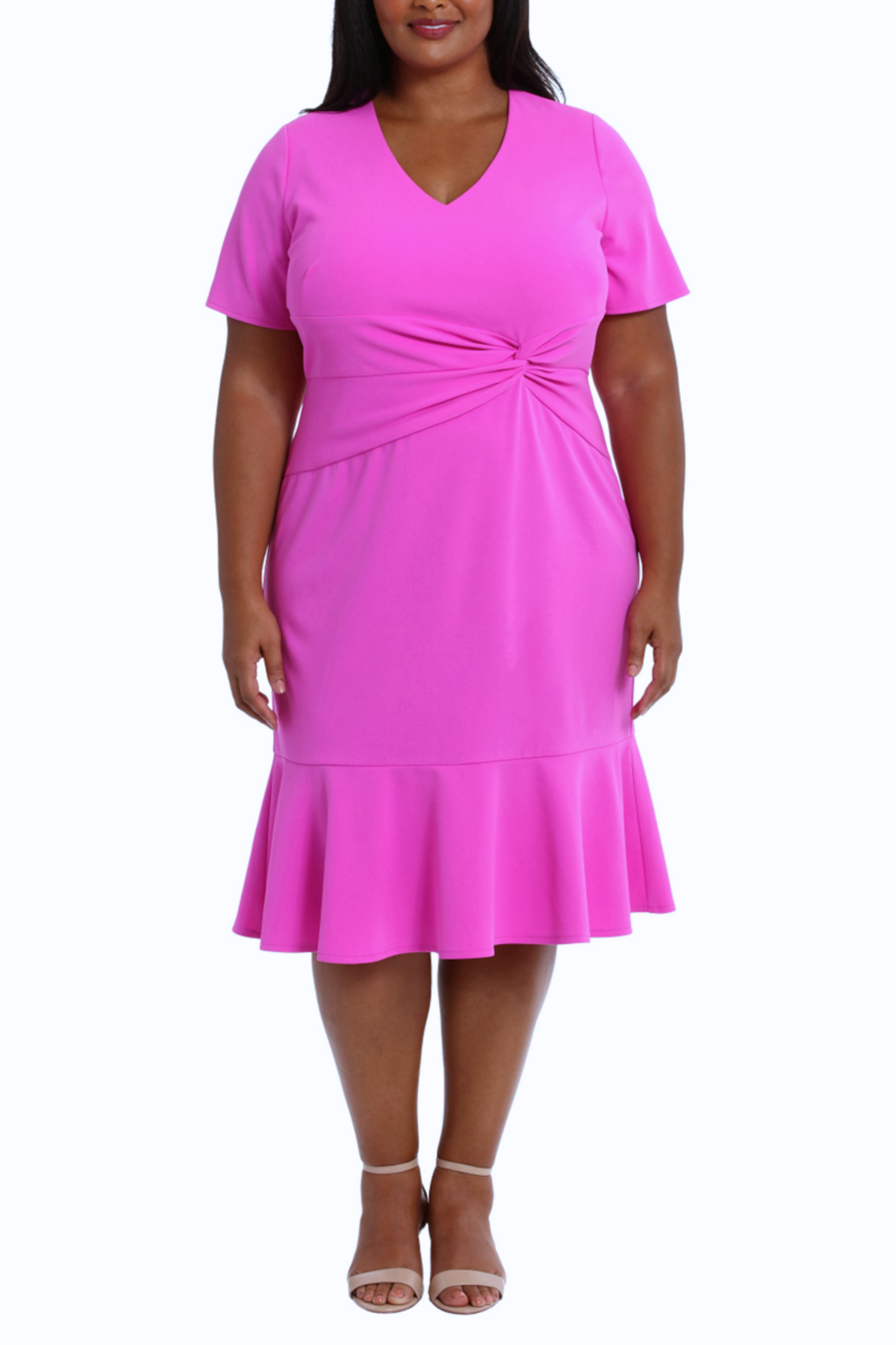 A snazzy and stylish sheath dress that features a V-neckline, short sleeves, a twisted-knot center design, a knee-length skirt with a ruffle, and a one-tier skirt. A short sleeve dress like this is great when it comes to attending dinner parties, cocktail hours, birthday celebrations, holiday gatherings, weekend brunches, luncheons, baby and bridal showers, and corporate events.
