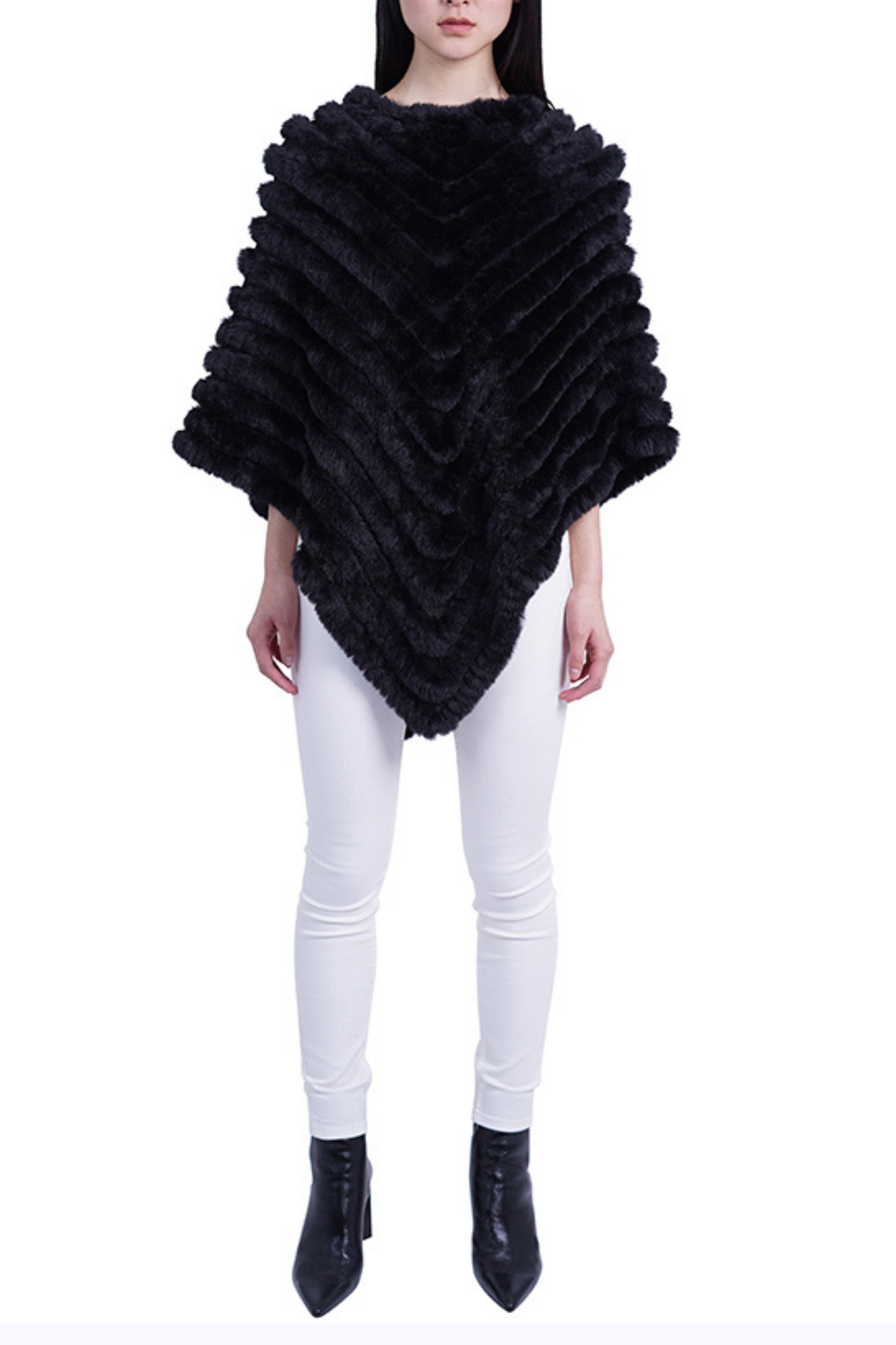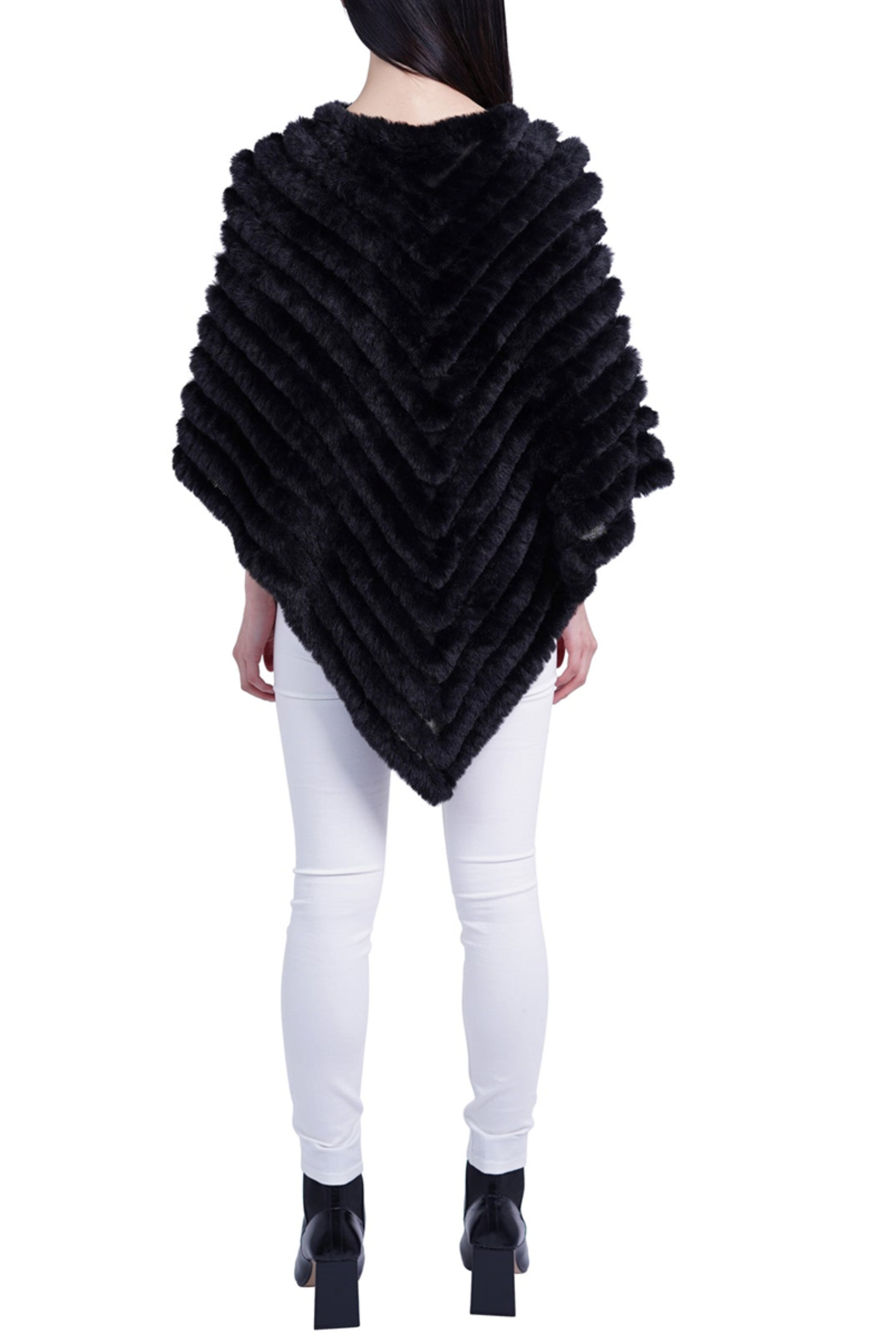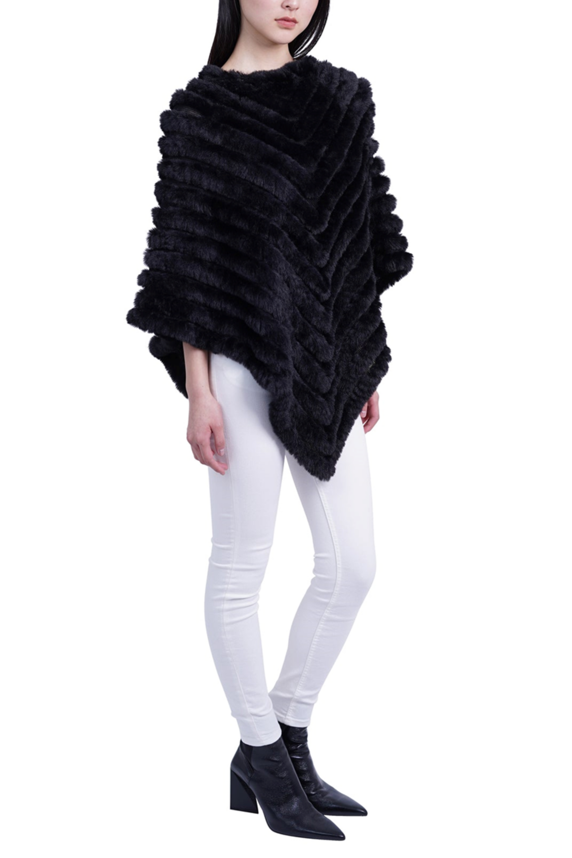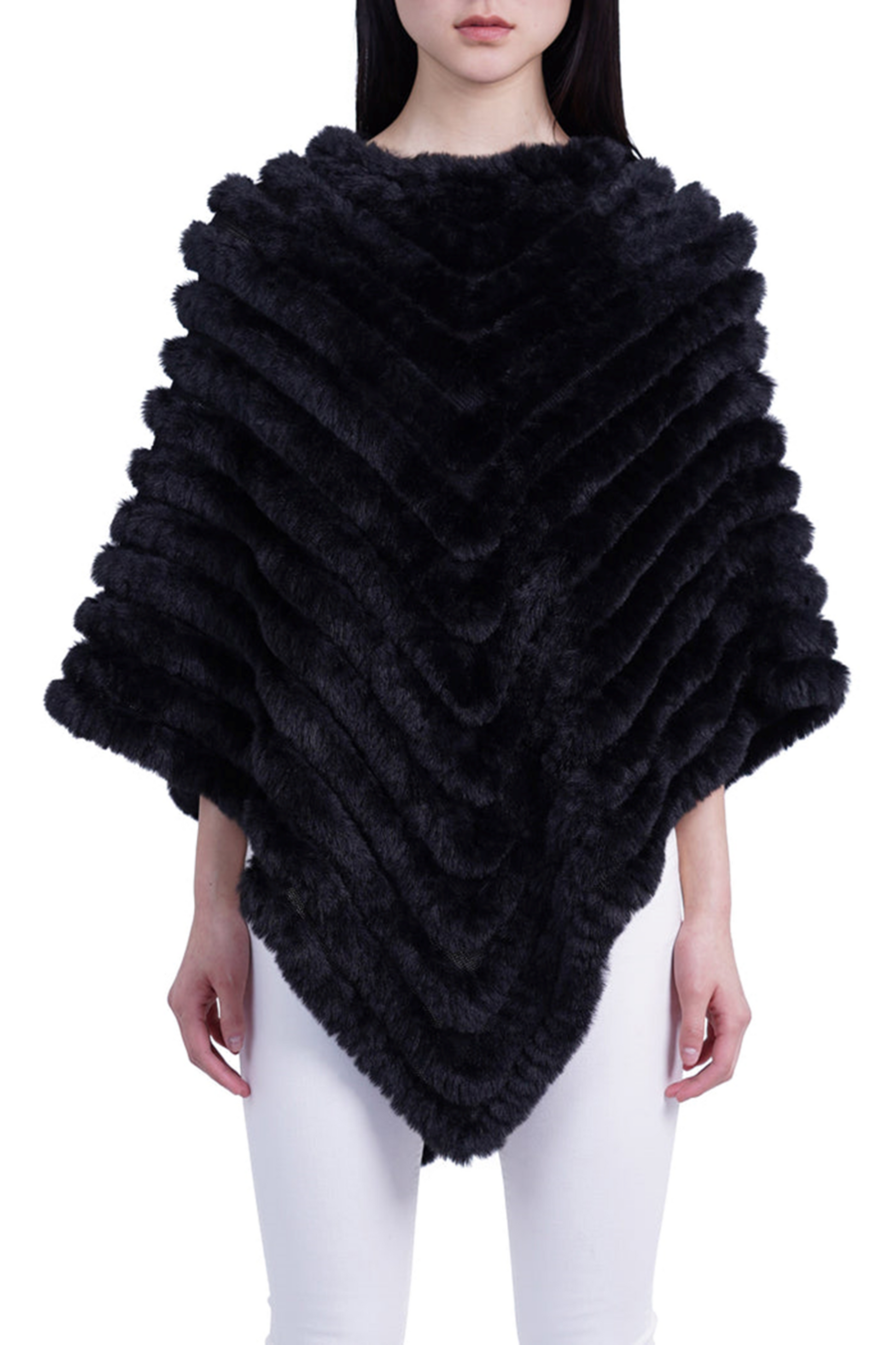 When you mix a little posh and Indigenous South American, you get this nifty pullover women's poncho that features a round neckline, and a V-shaped, chevron motif with a contrast of faux fur and mesh knit. This chic faux fur sweater is made for the colder months to pair with slacks, jeans, and skirts. It's perfect for attending parties, cocktail hours, or dinner dates, and it can be dressed up or down.