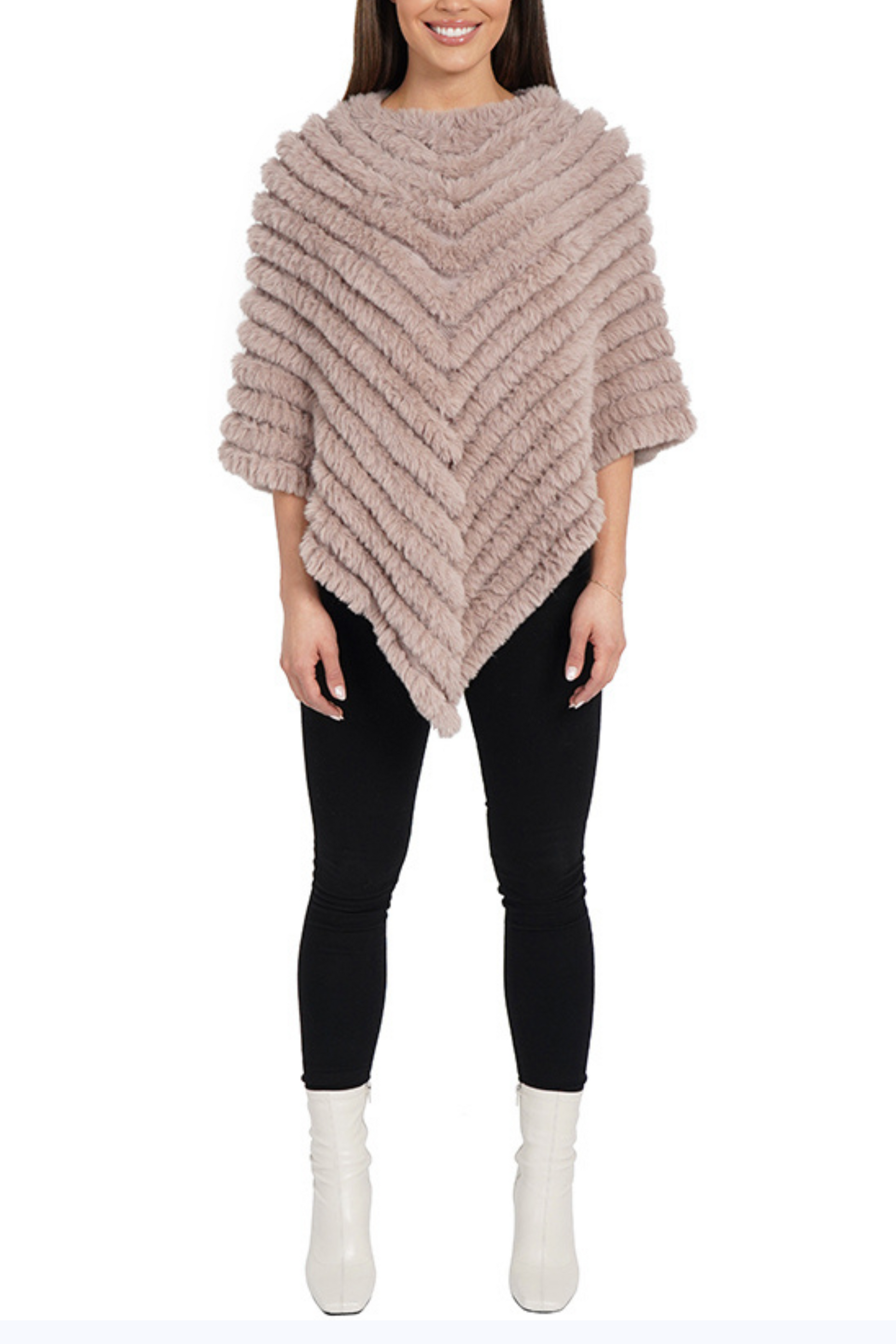 When you mix a little posh and Indigenous South American, you get this nifty pullover women's poncho that features a round neckline, and a V-shaped, chevron motif with a contrast of faux fur and mesh knit. This chic faux fur sweater is made for the colder months to pair with slacks, jeans, and skirts. It's perfect for attending parties, cocktail hours, or dinner dates, and it can be dressed up or down.