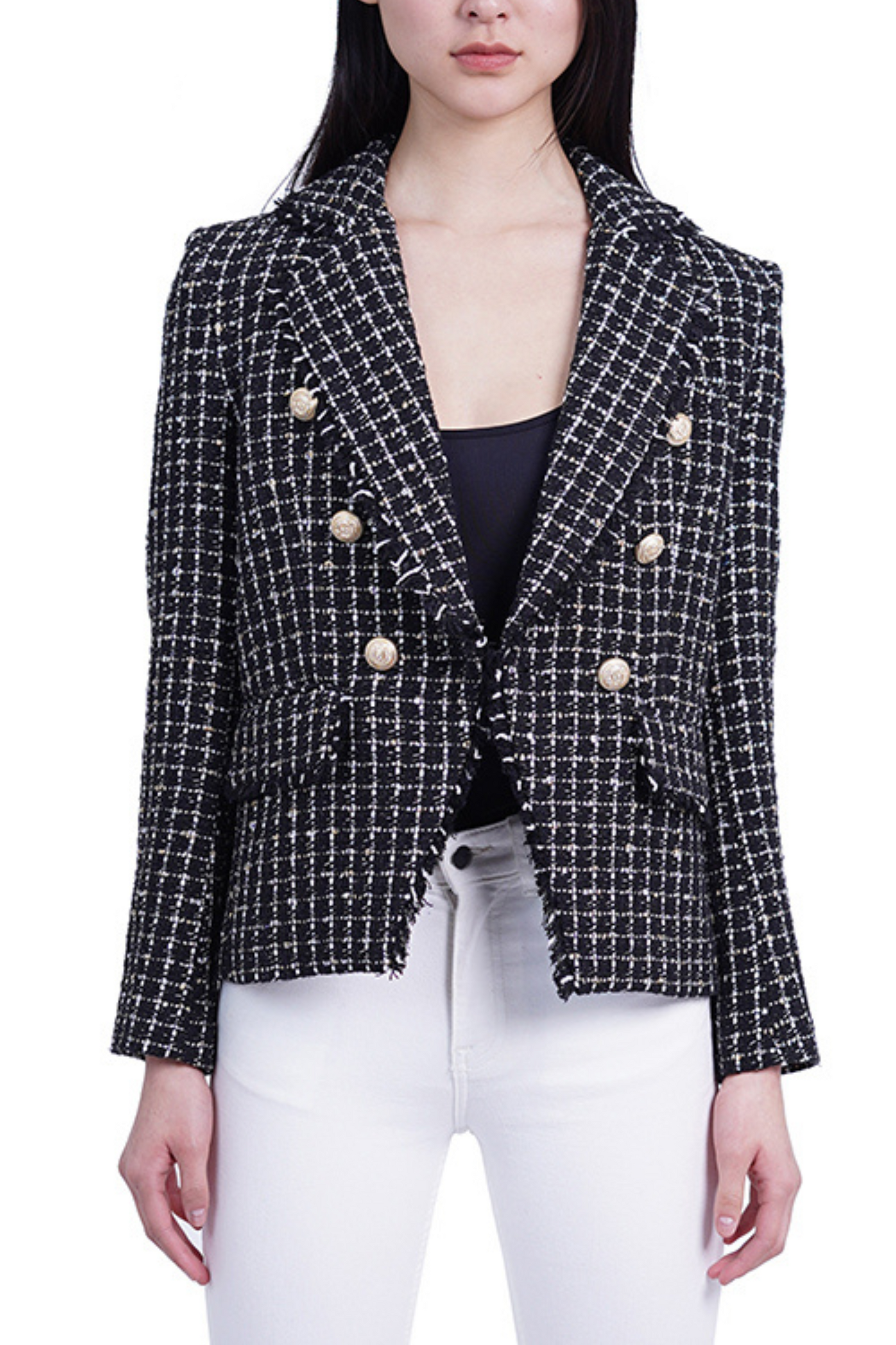 This isn't an ordinary women's blazer, but a unique one with long sleeves, faux-flap pockets, a notched lapel collar, a double-breast design with gold medallion buttons, fringe detail, a hip-length silhouette, and an overall metallic tweed material. This ladies tweed jacket is ideal for wearing with slacks, skirts, jeans, and dresses to the workplace, cocktail parties, and dinner dates.