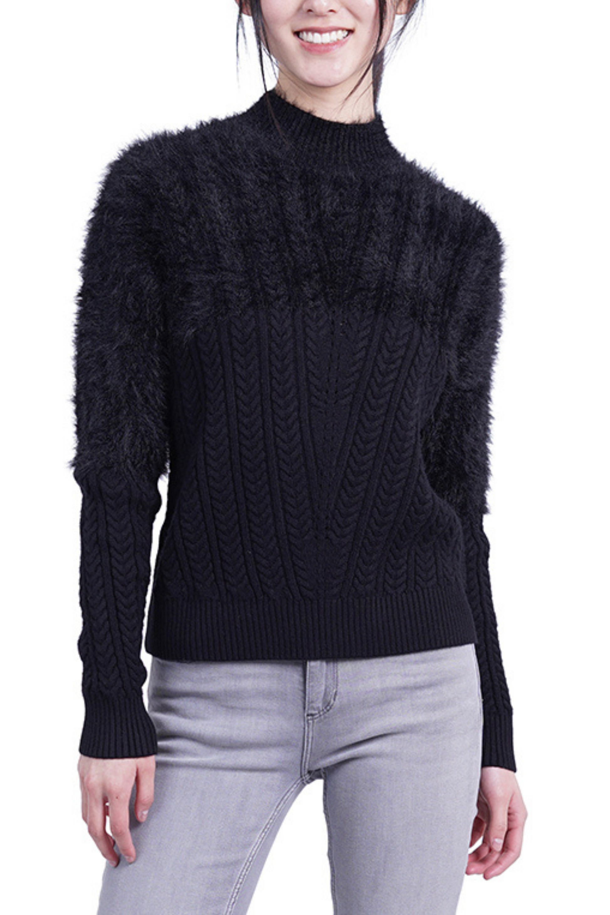 You're sure to keep warm and cozy during the fall and winter months wearing this chic-looking fuzzy sweater that features a mock neckline, a contrast design of an upper half of faux-mohair, and a lower half of cable knit, along with long ribbed cuff sleeves that match the hemline. This women's sweater is ideal for the workplace, parties, date nights, and ski trips.