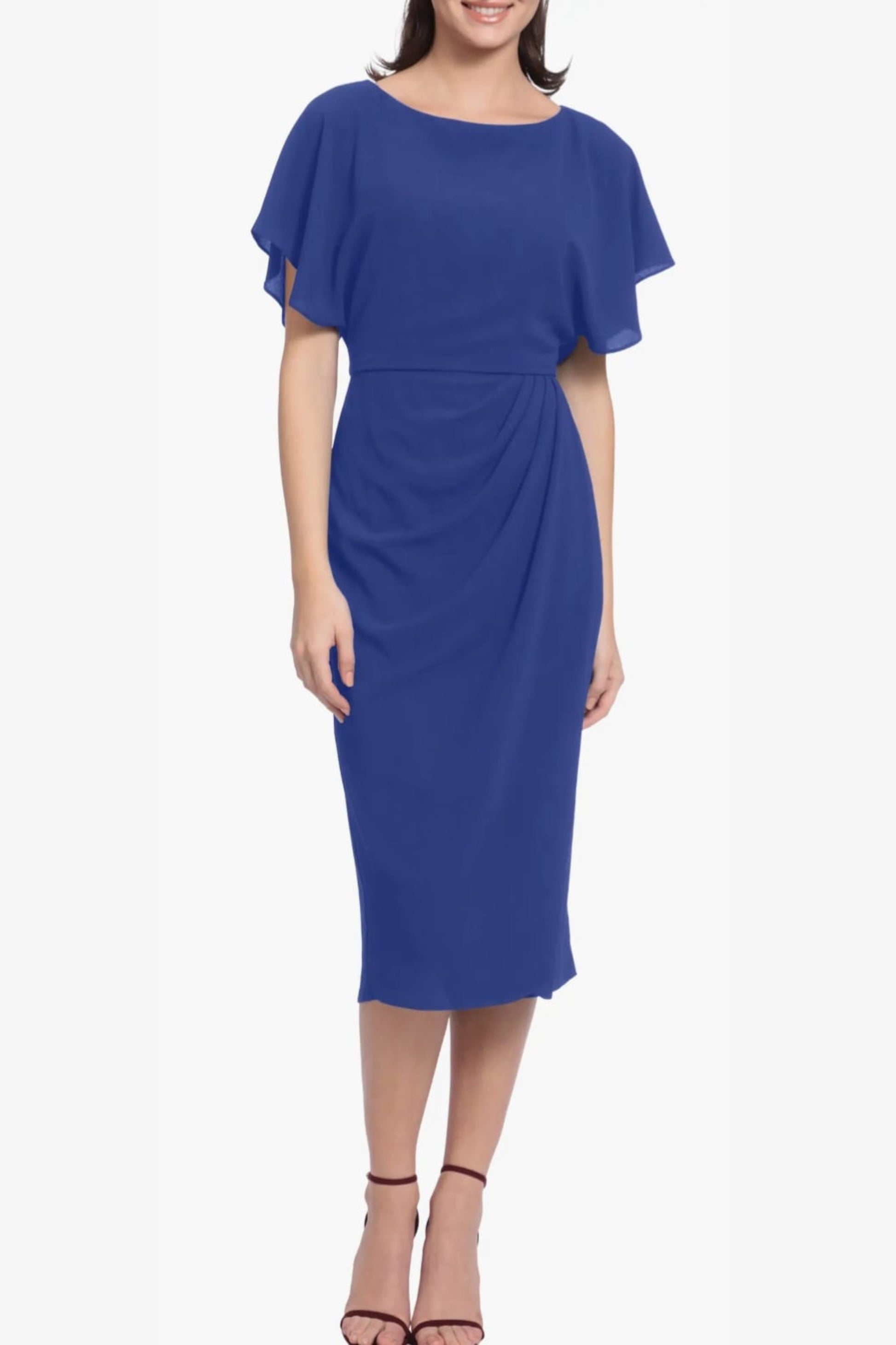 Elegance will emanate when you wear this divine cocktail dress that features a boat neckline, short dolman sleeves, and a mid-length, draped-over skirt with pleated detail. This lovely sheath dress is a necessity for attending weddings, dinner parties, luncheons, religious services, holiday gatherings, and birthday celebrations, and it looks great with a pair of heels or pumps.