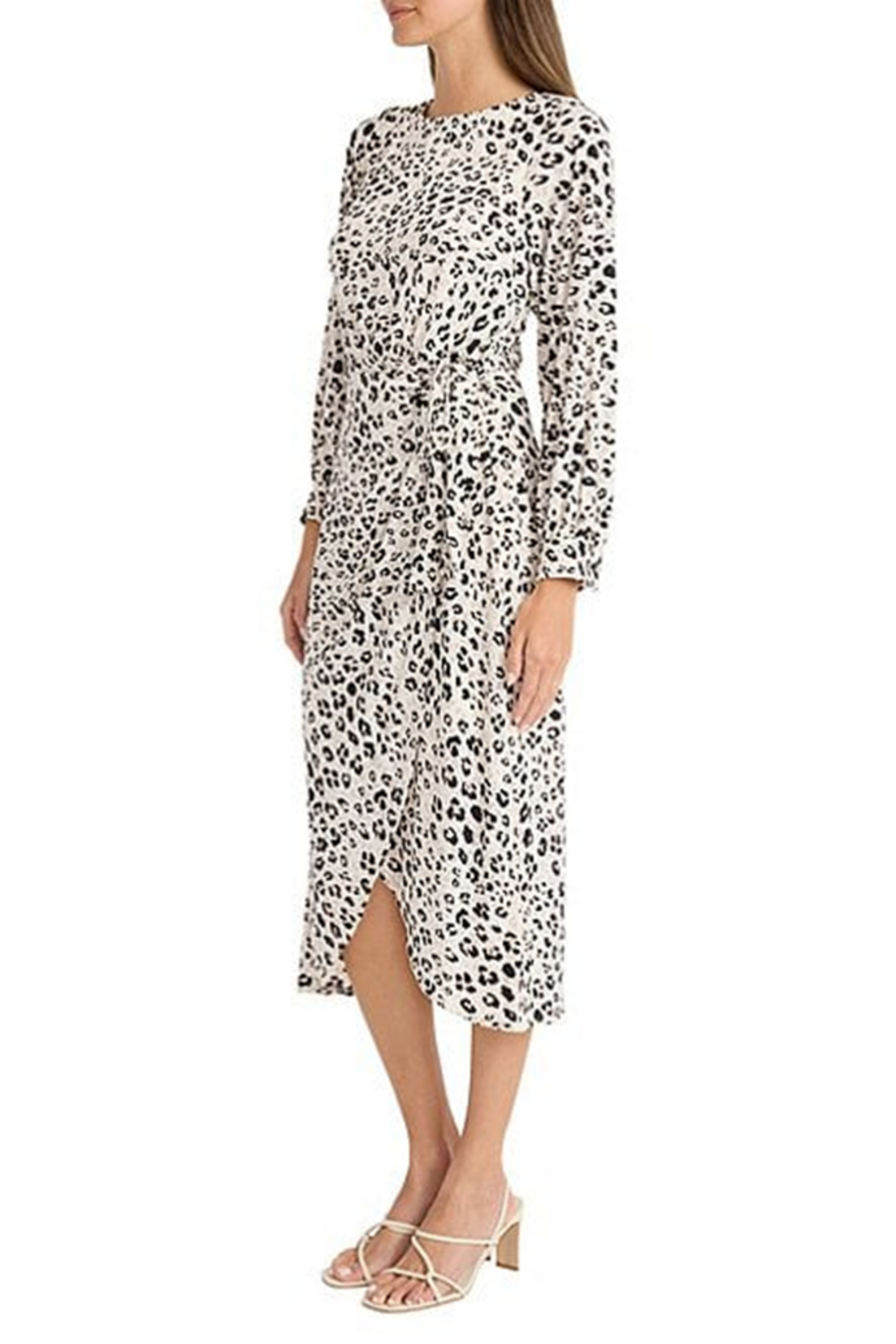 A classic and timeless look is exemplified with this charming animal print dress that features long one-button cuff sleeves, a round neckline, a below-the-knee with a draped-over side waist-tie skirt. This lovely midi dress contains a flattering design and can be dressed up and down and worn throughout the year to work, parties, corporate events, and religious ceremonies.