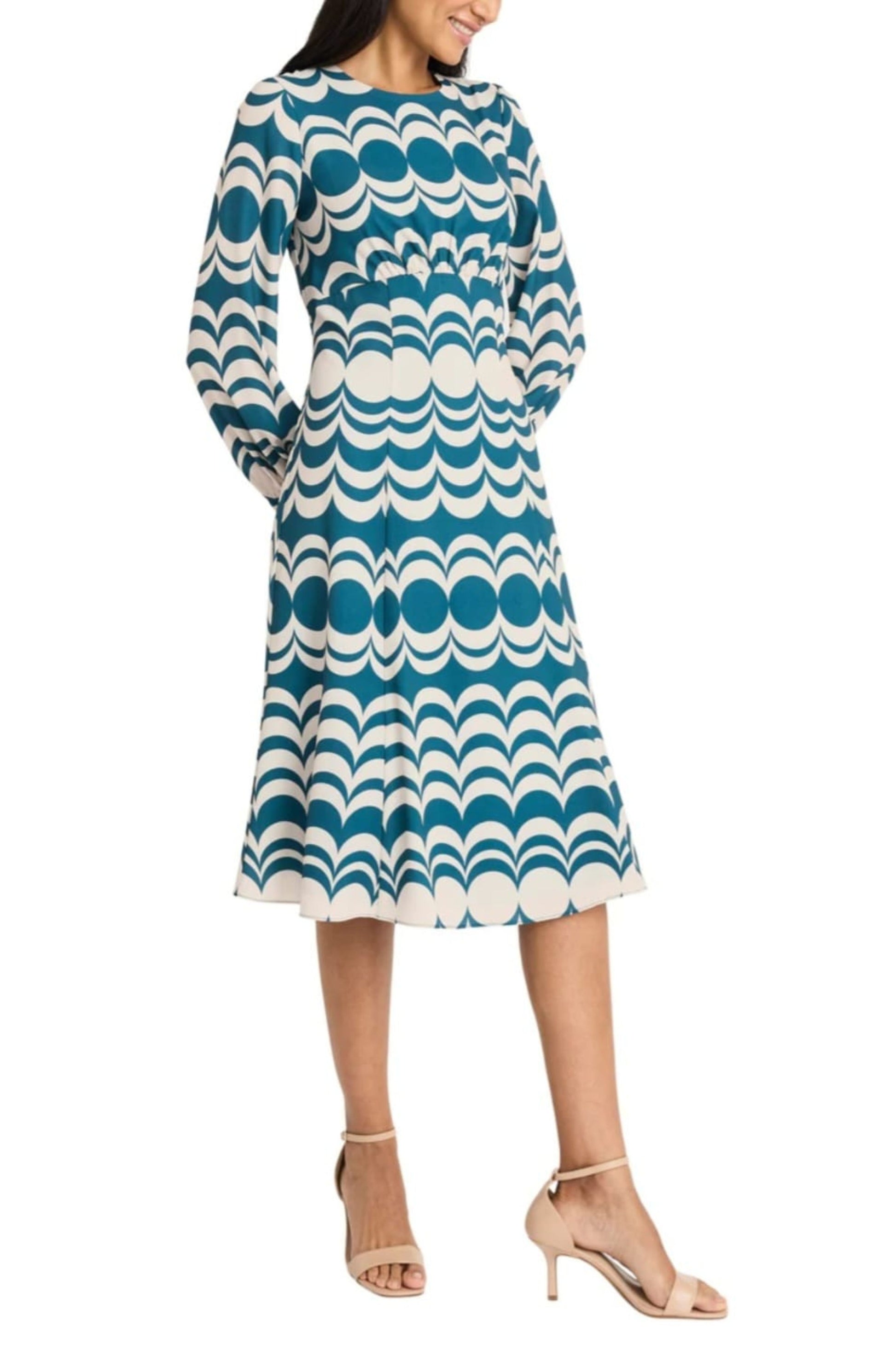 Show off your sense of style and your waistline in this lively geo print dress that features long button-cuff sleeves, a crew neckline, and a flared, knee-length, A-line skirt that pairs well with heels, sandals, boots, and pumps that can be worn year-round, day and night, to dinner parties, cocktail hours, baby and bridal showers, luncheons, and Sunday brunches.