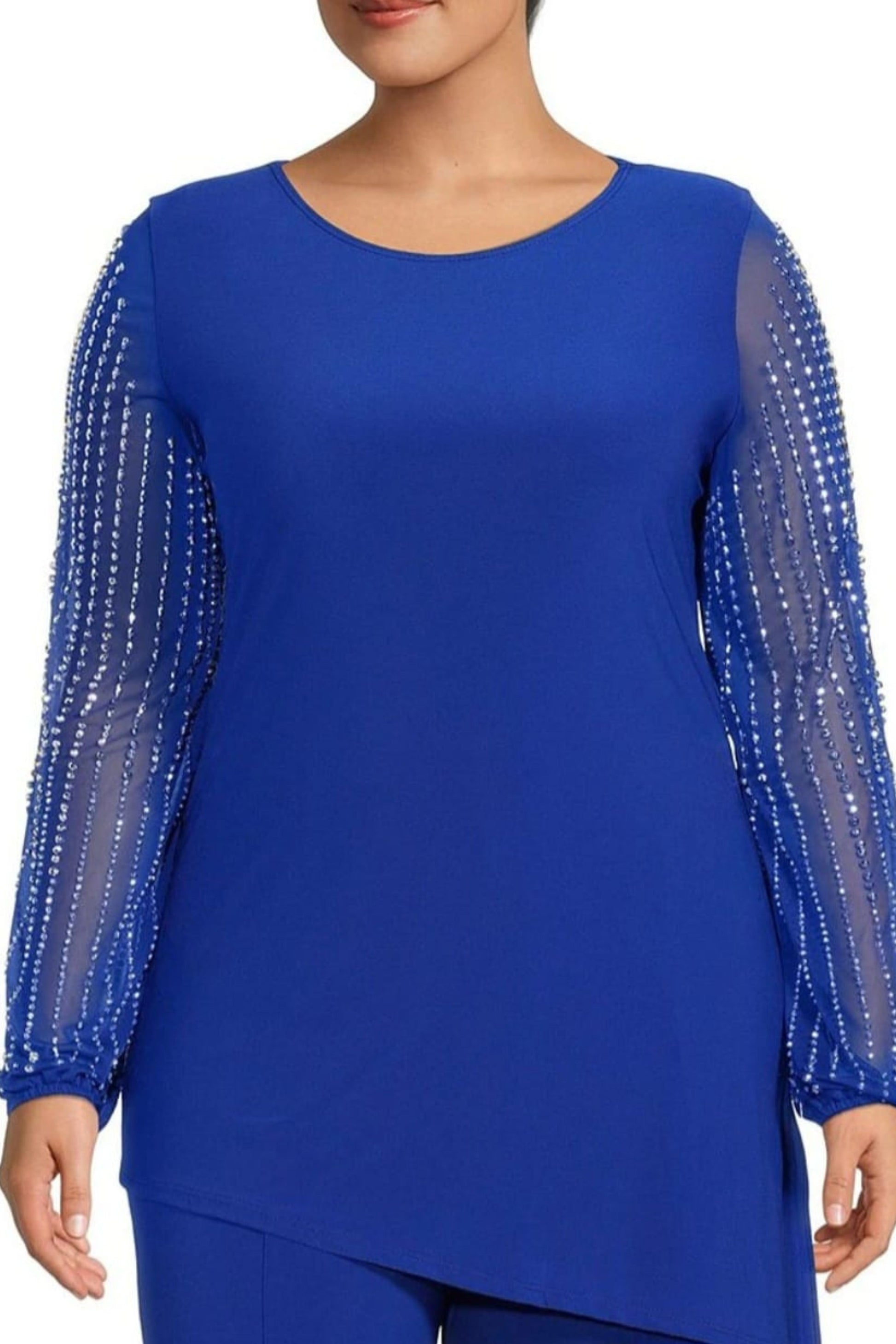 Sheer beaded long sleeve, boat neckline top paired with elastic waist wide leg jersey pants. STYLE: 650987