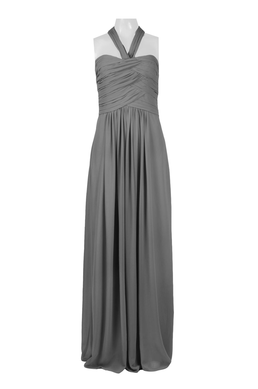 A pretty evening dress that also makes a wonderful bridesmaid dress, features a halter neckline, a ruched and pleated crisscross bodice, and a lovely floor-length draped A-line skirt. This formal dress has you feeling like a princess, and it's also great to wear to proms, homecomings, sweet sixteen parties, and an array of special occasion events where you want to look fabulous.