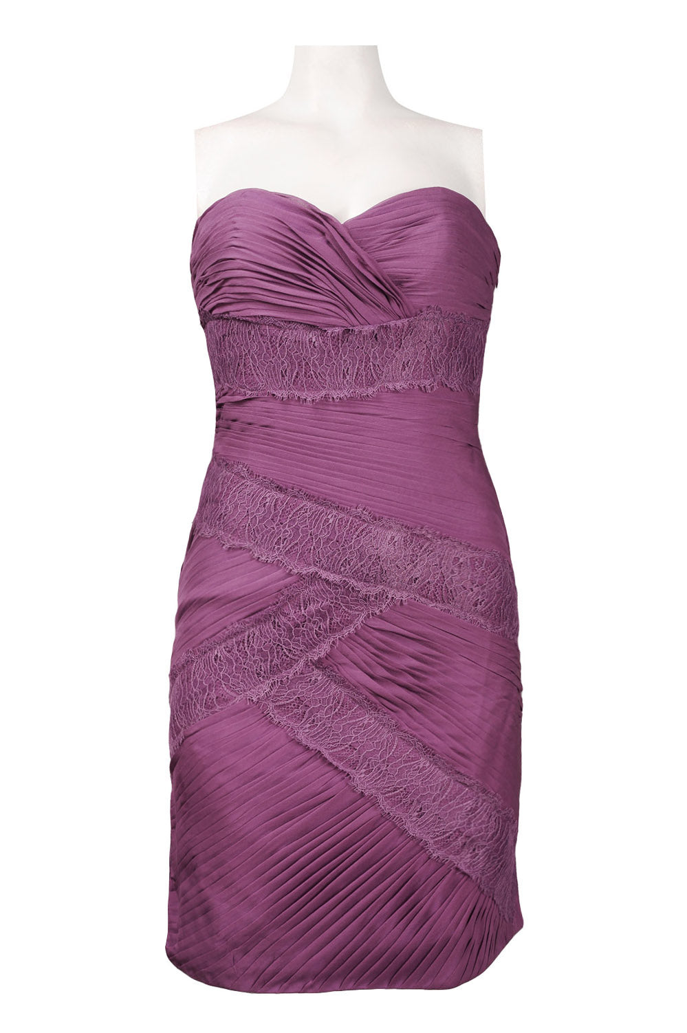 A smashing and sultry party dress that is made for the fun and fearless, features a striking asymmetrical design, beautiful shirring with contrast lace panel insets, a sweetheart's neckline, and a knee-length skirt. This ravishing strapless dress will have all eyes on you when you walk through with your sexy high heels at that next cocktail party, dinner date, and holiday celebration.