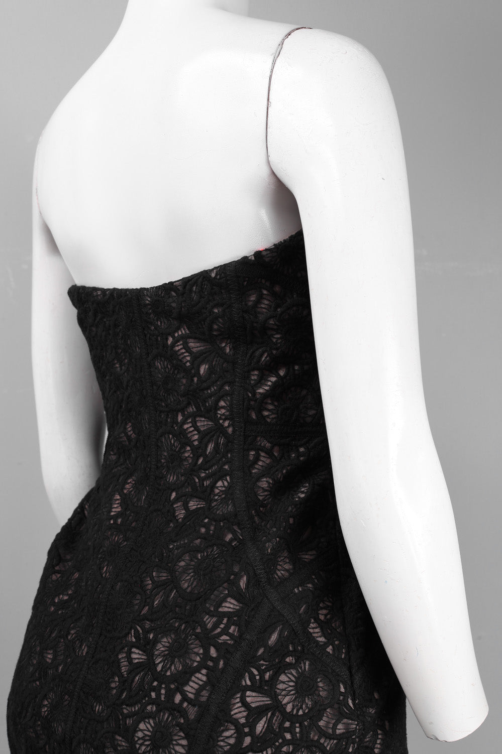 You'll bring out the inner sex symbol in you when you wear this beautiful cocktail dress that features a strapless sheath-style silhouette, a square neckline, embroidered floral overlay fabric, and a knee-length skirt. This sultry strapless dress showcases your curves at that next birthday party, nightclub, gala, or holiday celebration, and it looks great with a pair of heels or pumps.