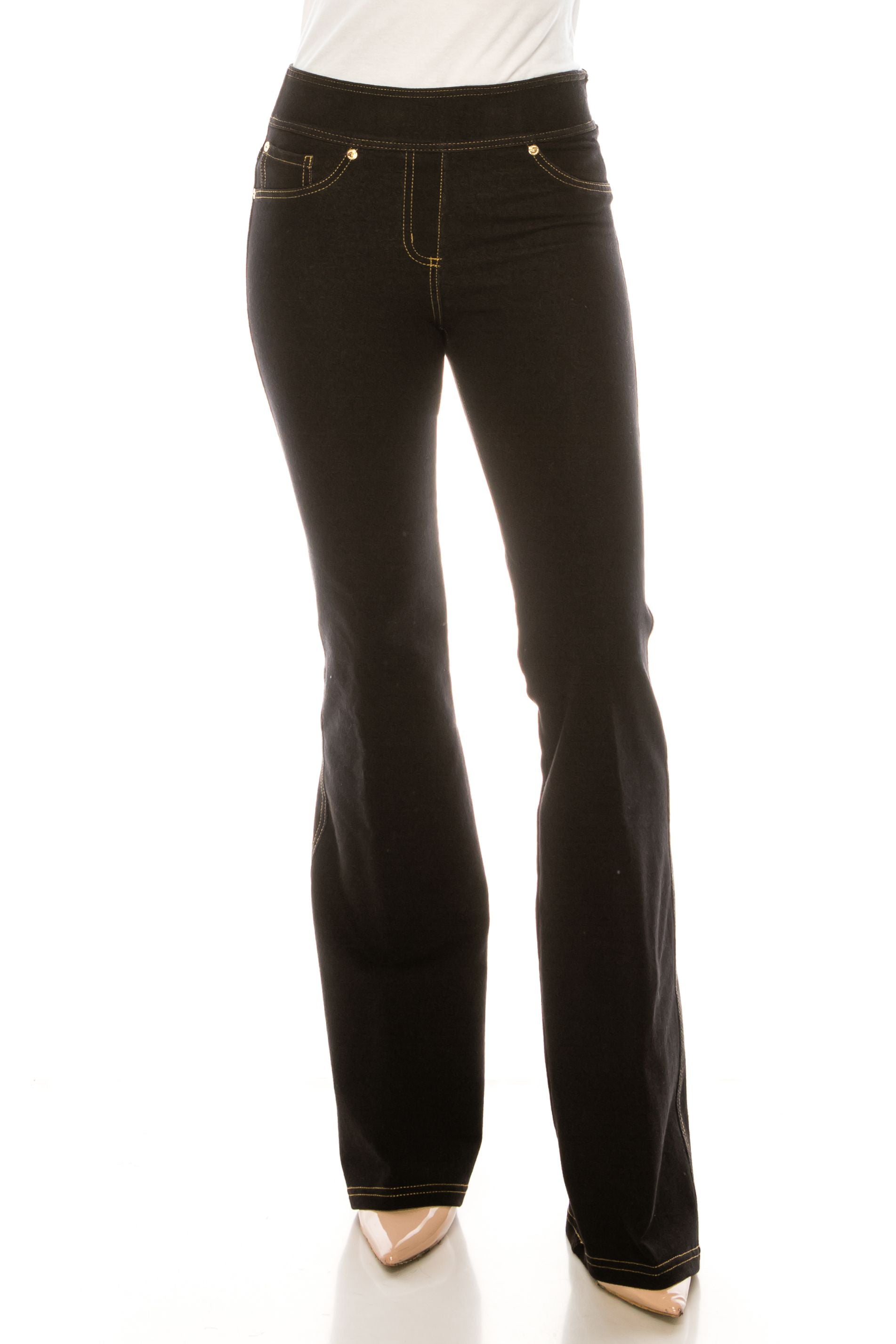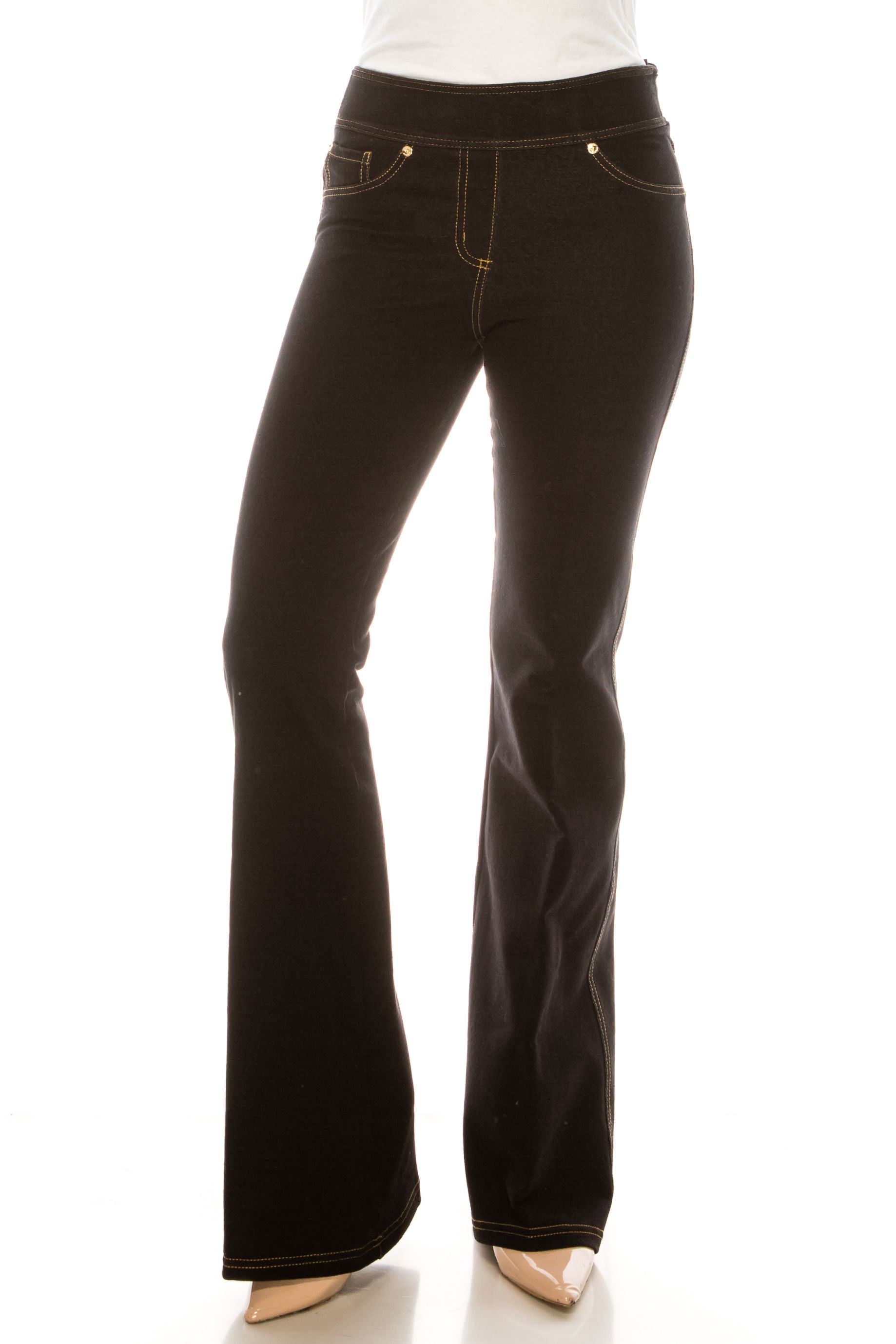 A mix of a little vintage and a lot of style with these jeggings for women that feature pull-on construction, stitching detail, gold hardware, a comfortable stretch, a flare-leg silhouette, five-pocket styling with one front, and two back working pockets that pairs well with sweaters, t-shirts, blouses, and blazers, and can be worn both day and night, to dinners and on dates.