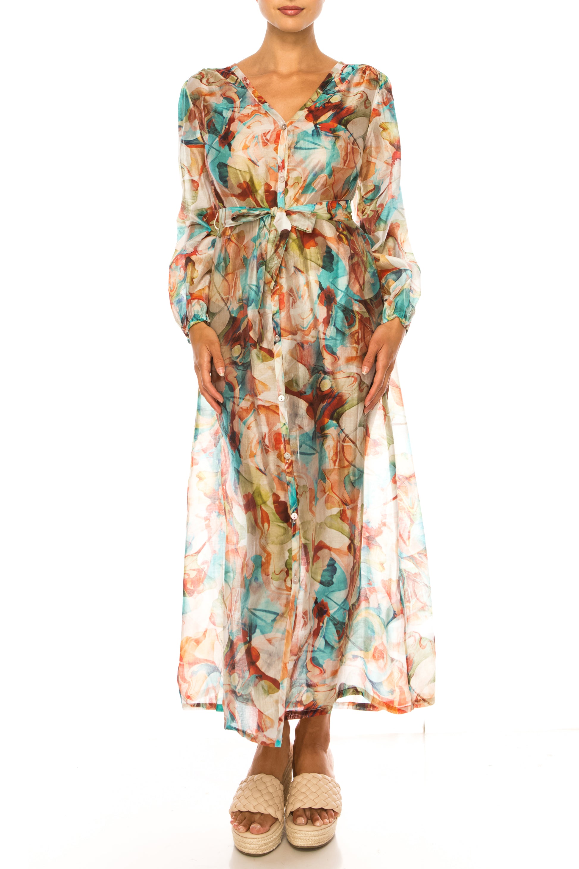 Showcase your style in this beautiful shirt dress that features a V-neckline, elastic-cuff balloon sleeves, a matching sash belt, a button-down full-length placket, an A-line maxi skirt, and an all-around beautiful print. This lovely maxi dress is perfect for a variety of parties, baby and bridal showers, vacations, and more, and it pairs nicely with wedges, sandals, flats, and heels.