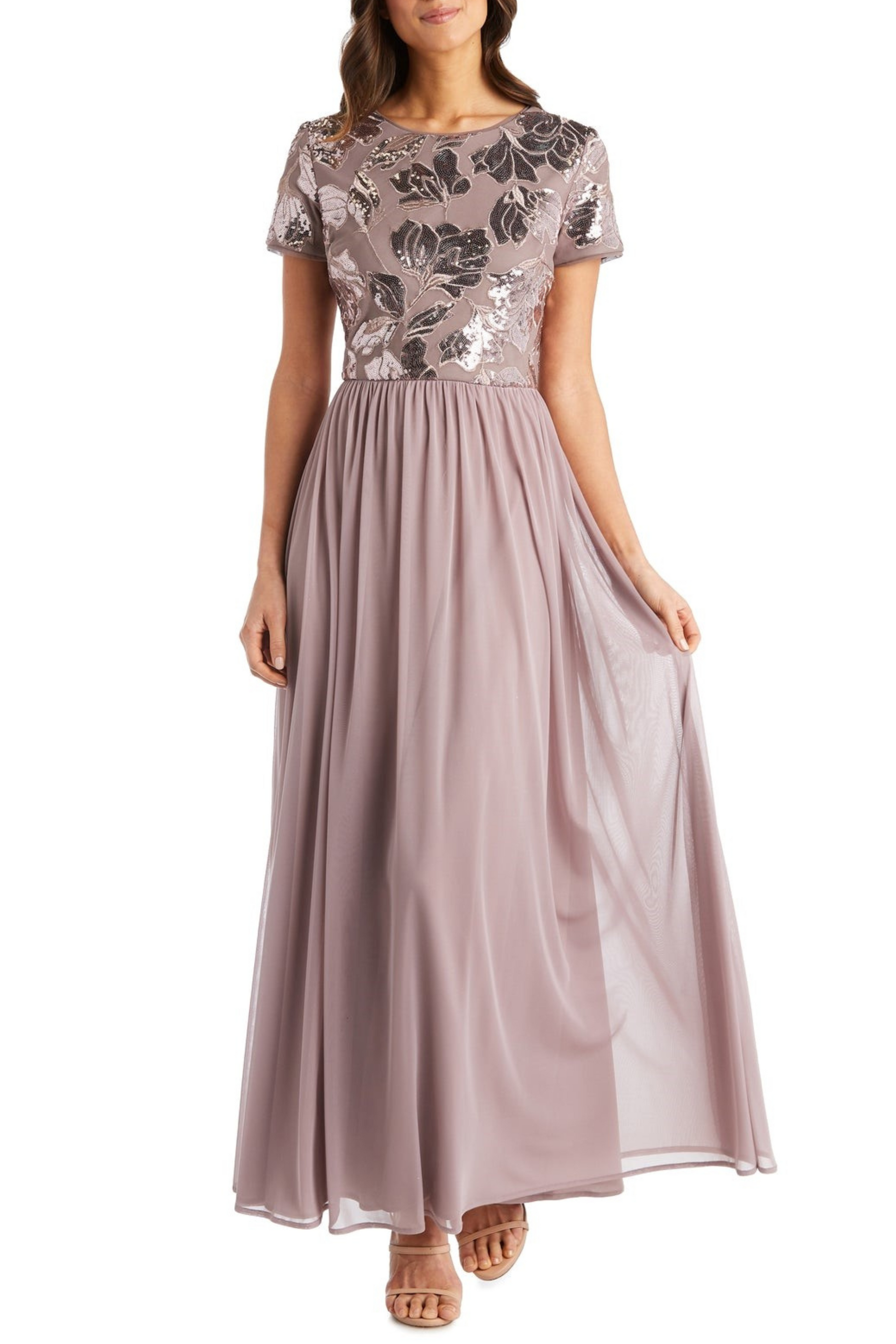 A magnificent and modest formal dress that is perfect for a mother of the bride or groom, and it features short sleeves, a round neckline, and a floral motif of sequins and embroidery that adorn the bodice, along with a long and flowy A-line skirt that is perfect for attending a wedding as a guest, balls, galas, and religious ceremonies.