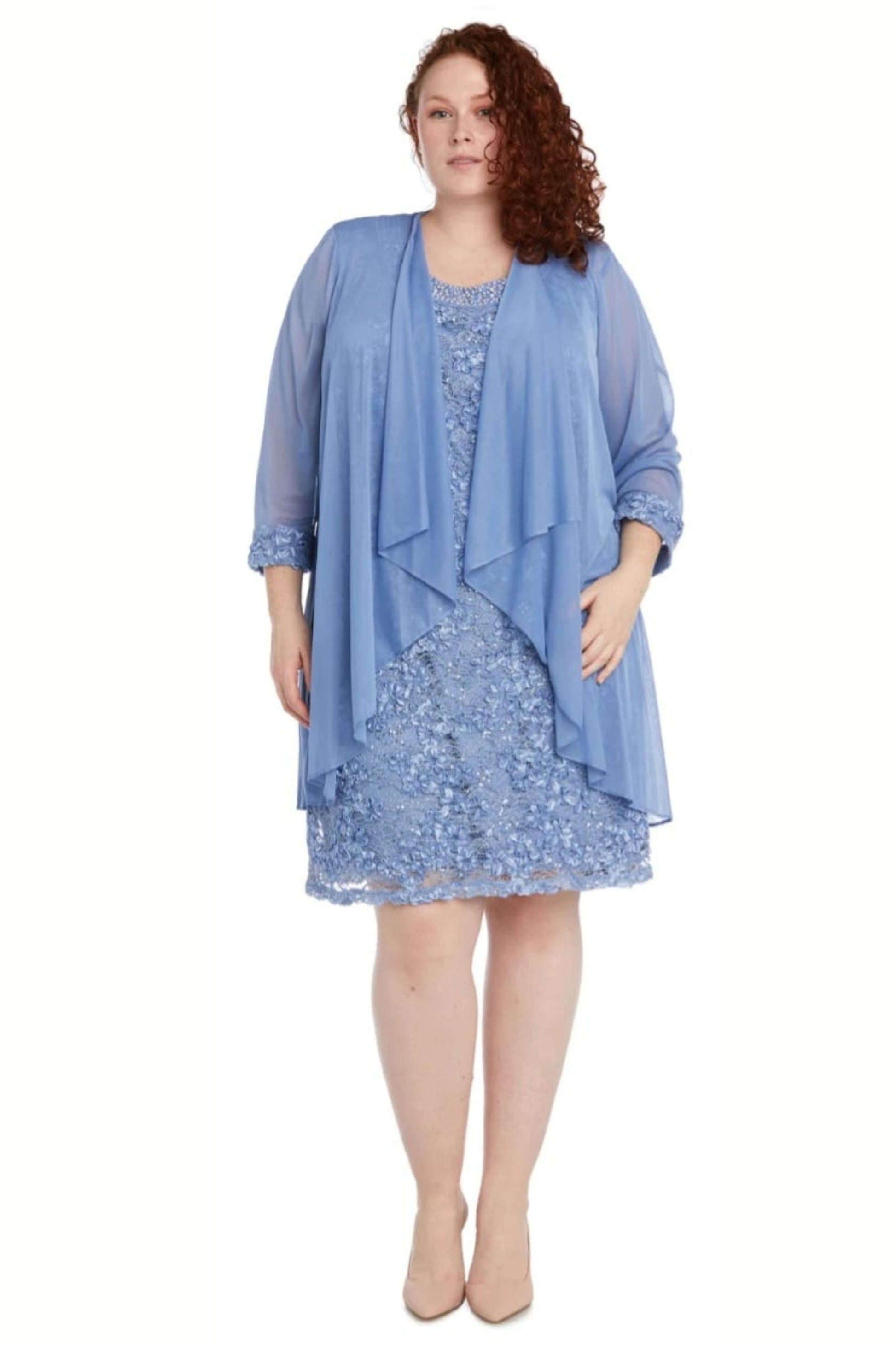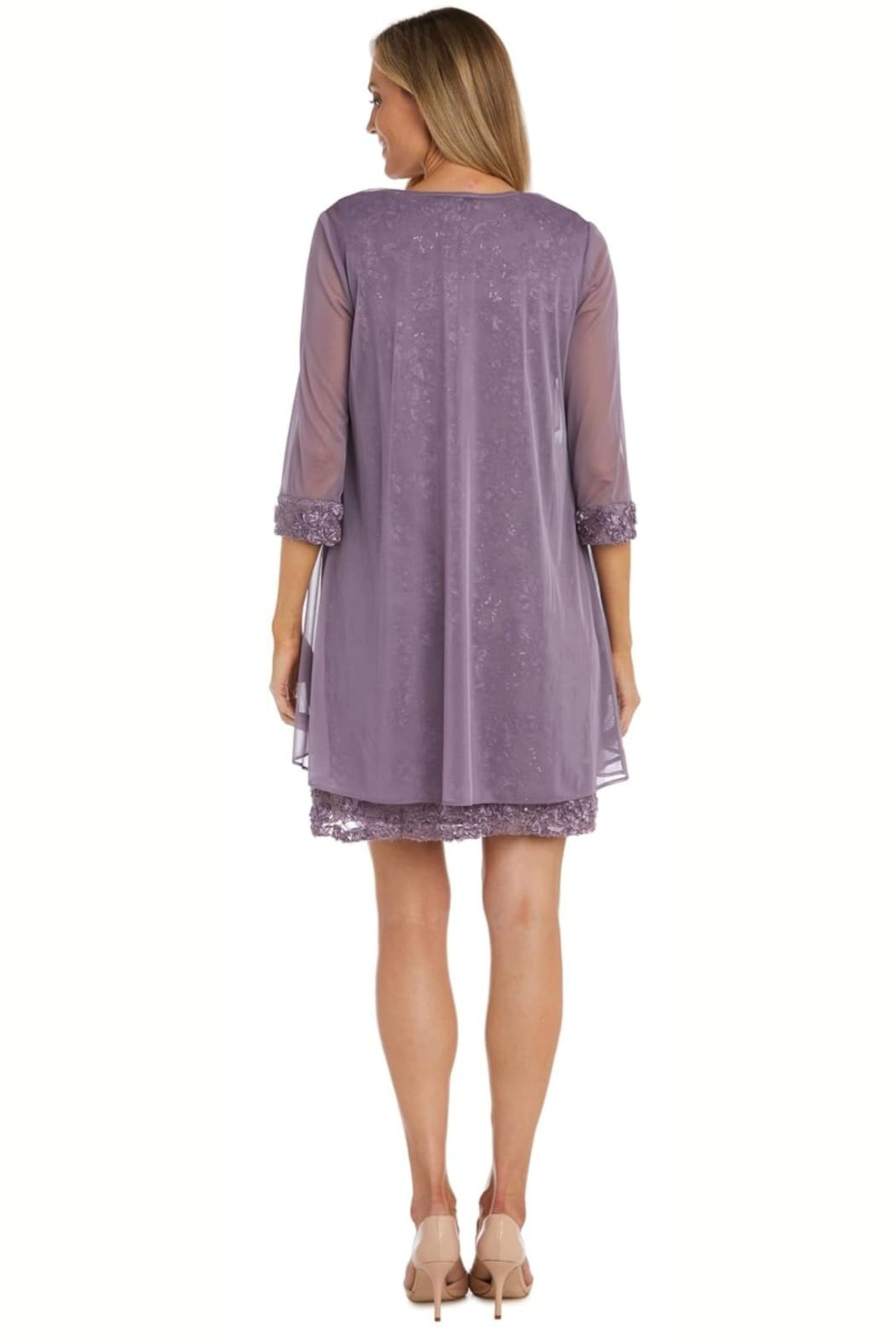 A strikingly stunning evening dress and jacket set that features a scoop neckline adorned with rhinestones, and tube and ball beading in a cluster design, a sleeveless knee-length skirt, and an overall lacy sequin and soutache embroidered motif that matches the 3/4 cuff sleeves of the open-front draped sheer jacket. This beautiful women's jacket dress will have jaws dropping!
