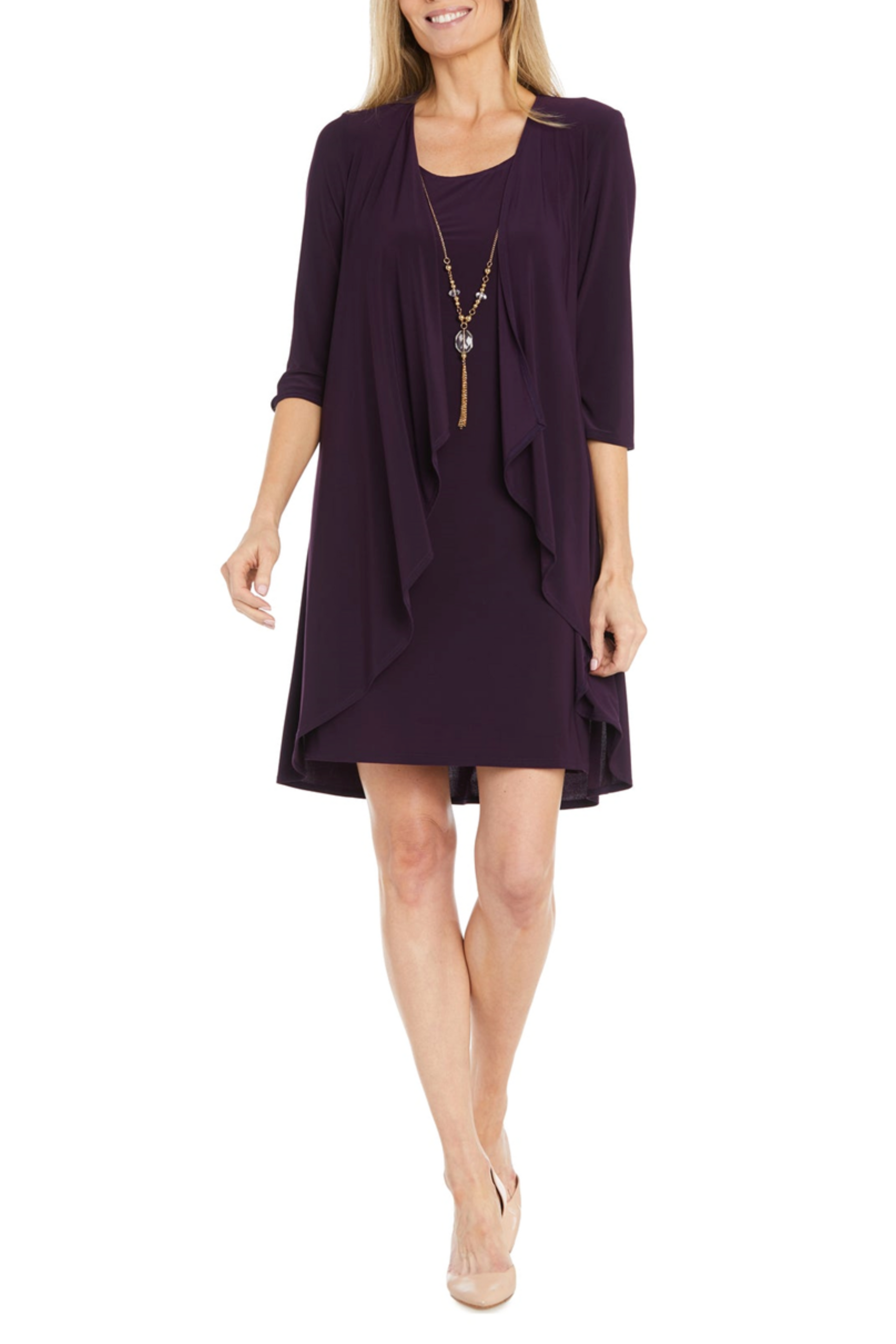 A simplistic and stylish, solid-colored two-piece jacket and dress duo that features an open-front waterfall hem, 3/4 sleeve, duster jacket that matches the sleeveless, round neckline shift dress. This lovely ladies dress and jacket set is great for the workplace, brunches, luncheons, cocktail parties, and dinner engagements. It also contains a long crystal pendant, gold beaded, and chain-tassel necklace.