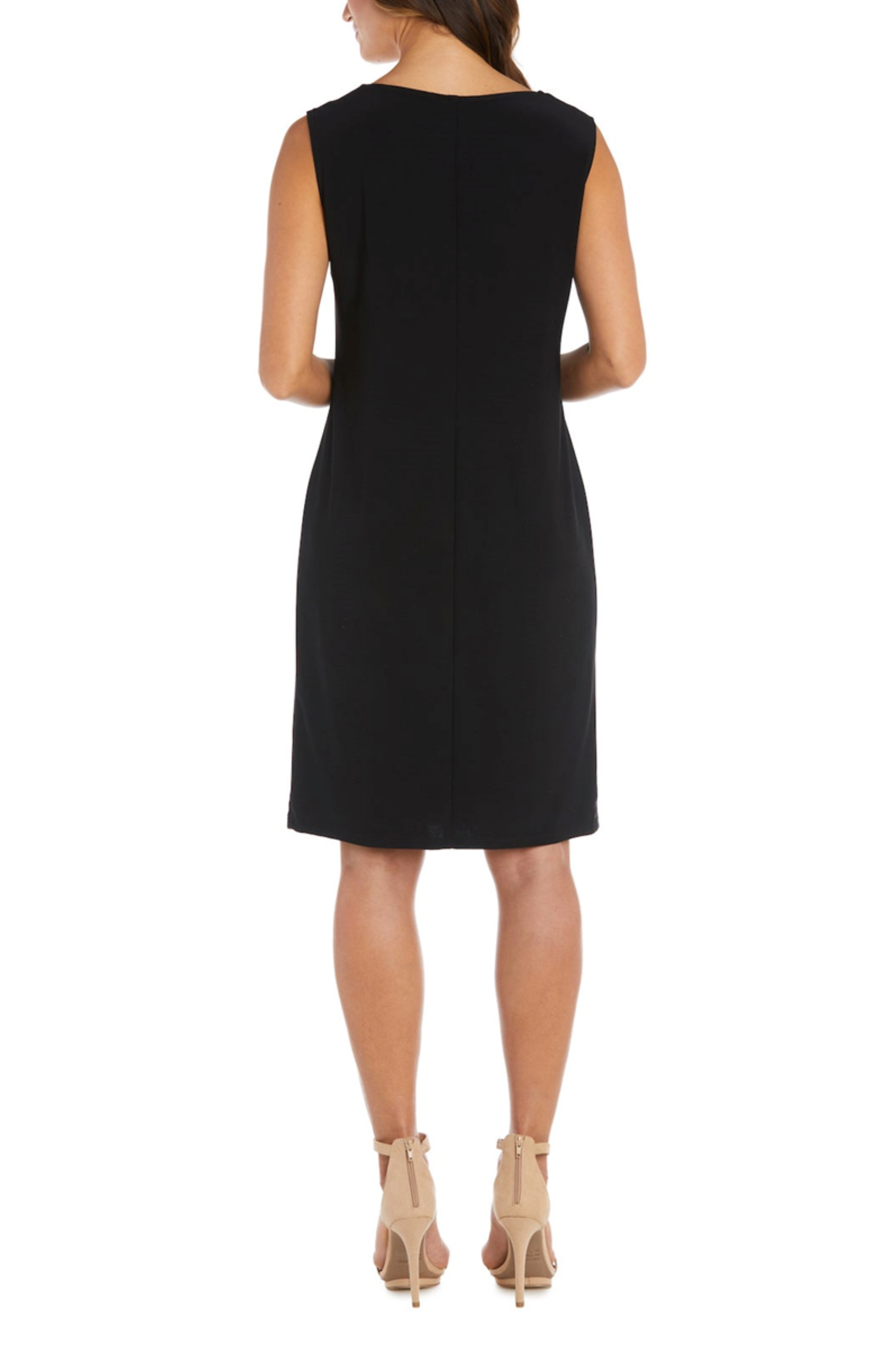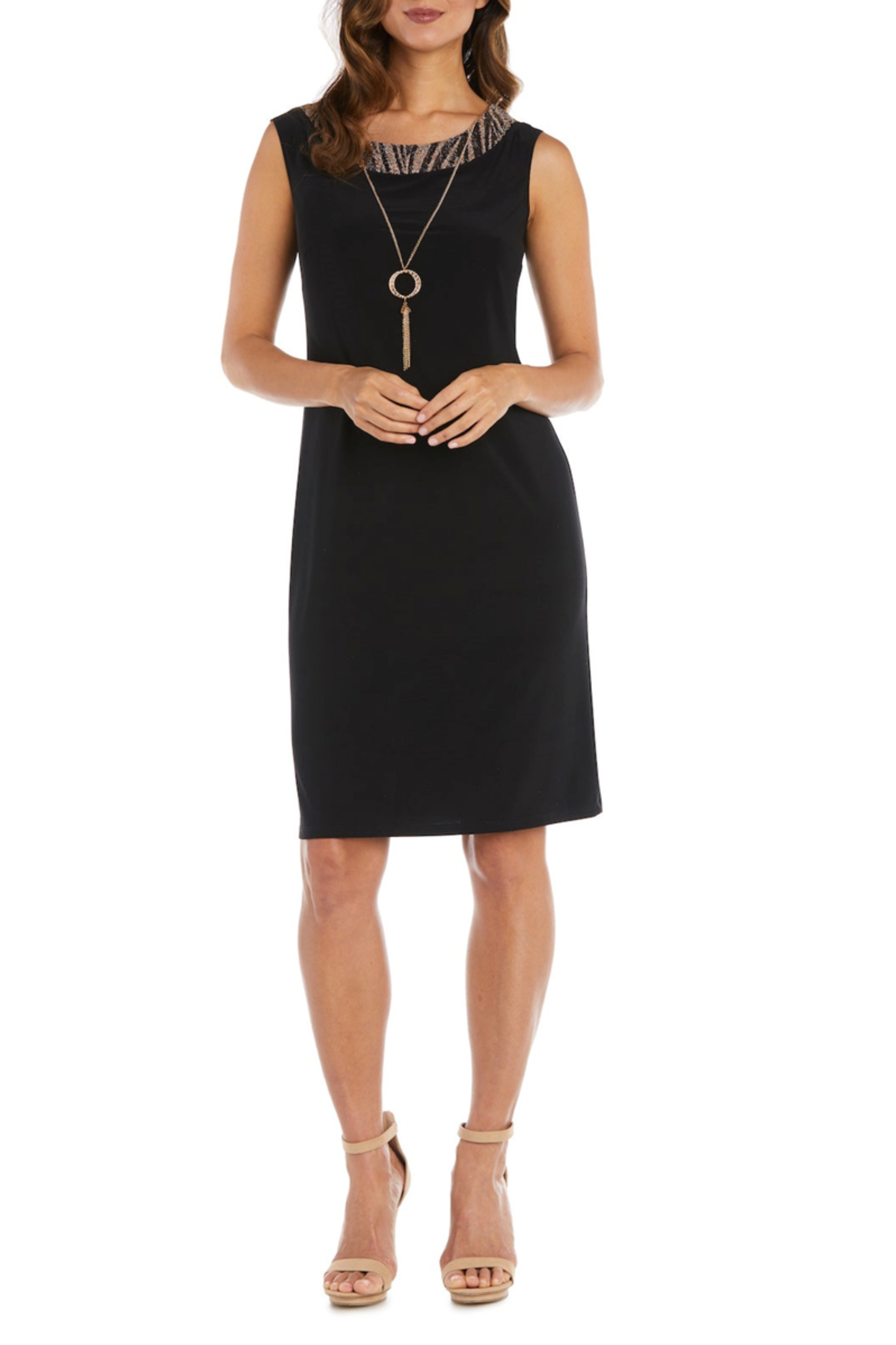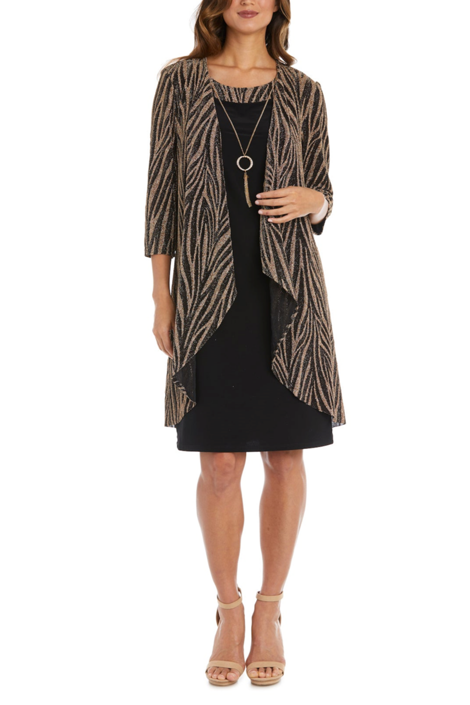 A glitzy evening dress and jacket two-piece set that features a metallic animal print, 3/4 sleeve, open-front, waterfall hem jacket that matches the scoop neckline of the sleeveless, knee-length sheath dress that you need to have handy for your busy social calendar. This jacket dress for ladies also contains a beautiful gold chain, five-ring, tassel-detail and bolo-style necklace.