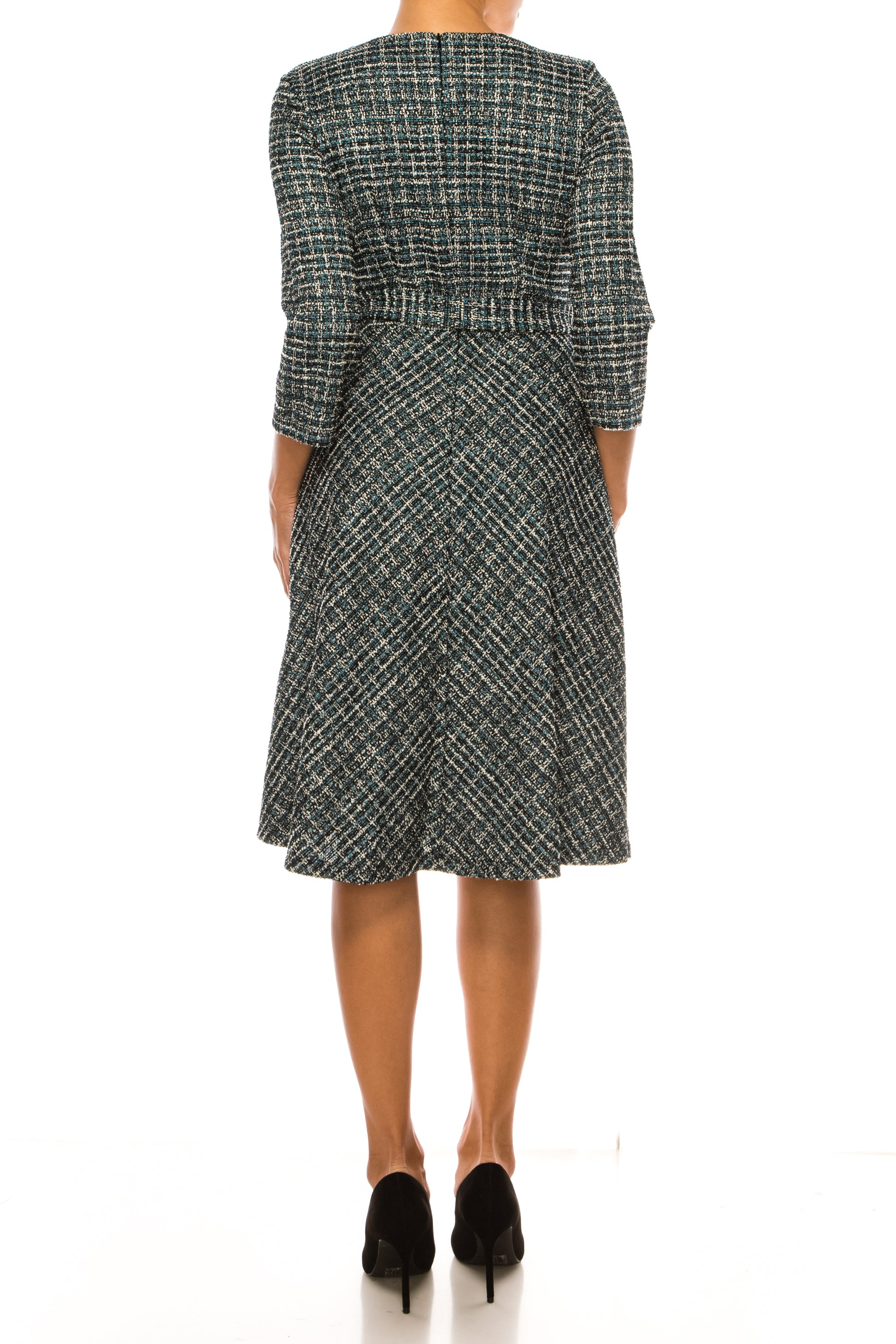 Why put style aside during the fall and winter months when you can still keep warm and look fantastic in this metallic tweed dress that features a V-neckline, 3/4 sleeves, a sash belt, and a knee-length A-line skirt. This fit and flare dress can be dressed up or down and worn during the day and night to work, to an array of parties, dinner engagements, and weekend brunches.