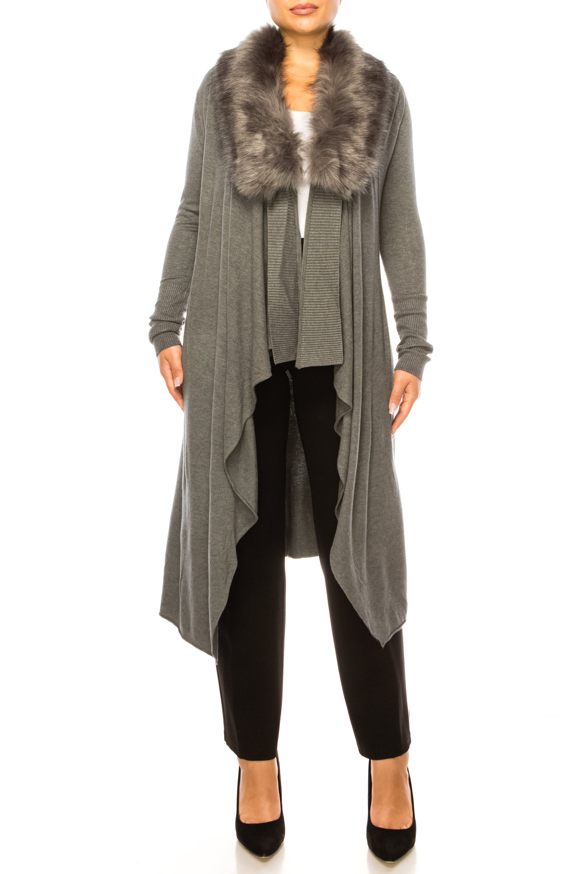 Dress up or down this lovely long, open-front, ribbed cuff sleeve sweater that features a fluffy removable faux-fur collar, along with a front-ribbed, sharkbite hem.