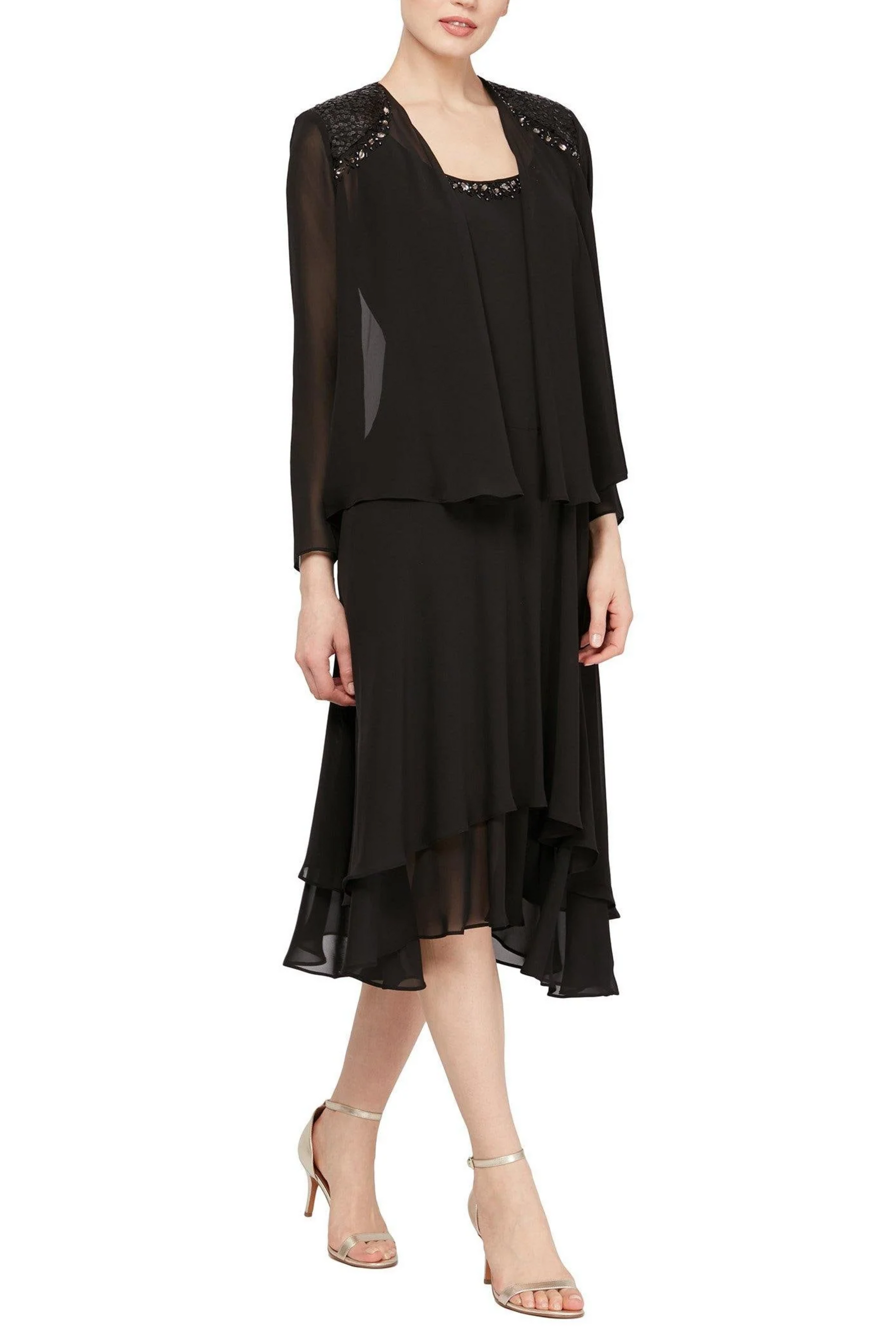 A feminine, flowy and formal dress and jacket two-piece set that features a sleeveless dress with an A-line double-layered skirt, and a scoop neckline adorned with assorted beading and rhinestone detail that matches the shoulders of the long sleeve, sheer, open-front, waist-length jacket. This lovely formal dress and jacket is ideal for attending weddings, primarily mothers of brides and grooms.