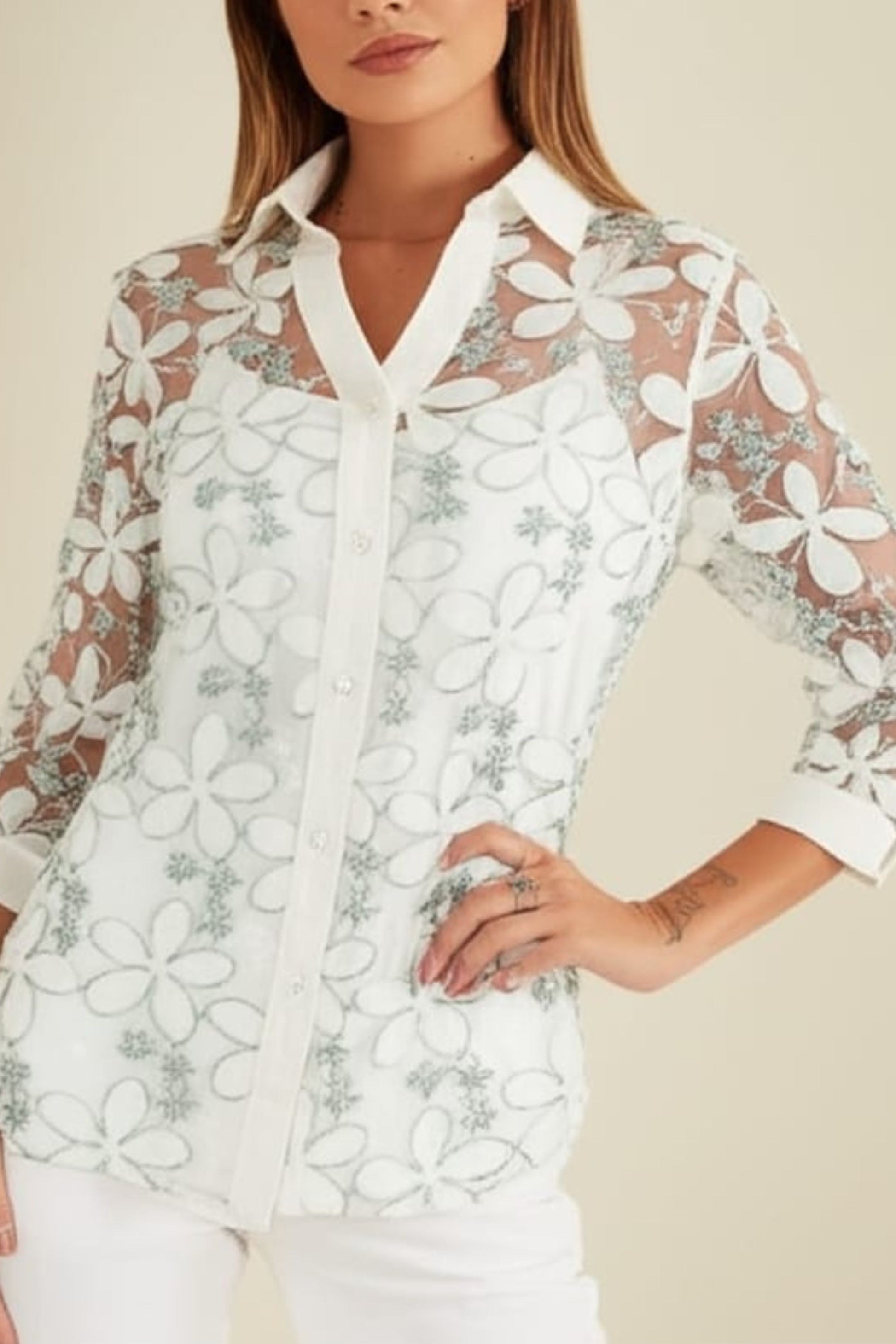 Having this button down shirt in your closet is a necessity when it comes to attending birthday celebrations, cocktail parties, and dinner engagements, and it pairs nicely with camisoles, trousers, jeans, skirts, and suits. This stunning sheer shirt features 3/4 one-button cuff sleeves, a spread collar, a button-down placket, and beautiful floral appliques and hexagon-shaped embroidery. Cami not included