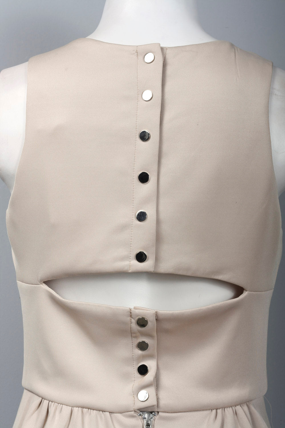 A charming sleeveless dress that features a thigh-length A-line skirt, a round neckline, and silver back snaps separated by a cutout design.