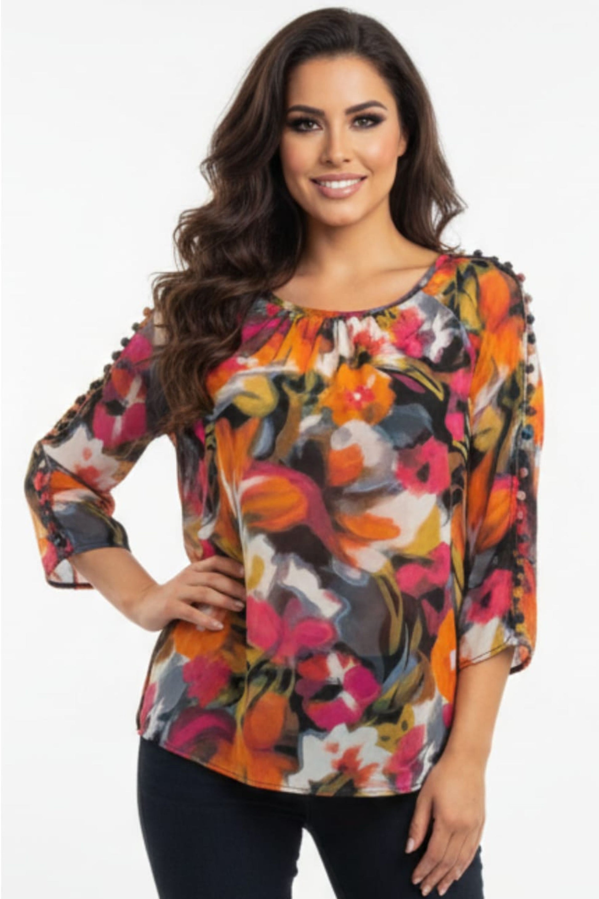 A beautiful printed 3/4 sleeve pleated boat neckline crepe top featuring split sleeves with button-loop closure and tie. STYLE: ST8150WK9